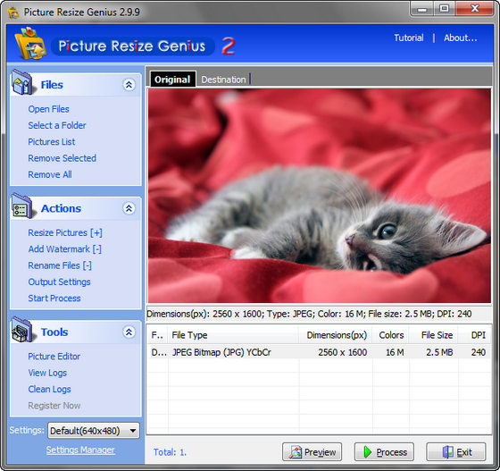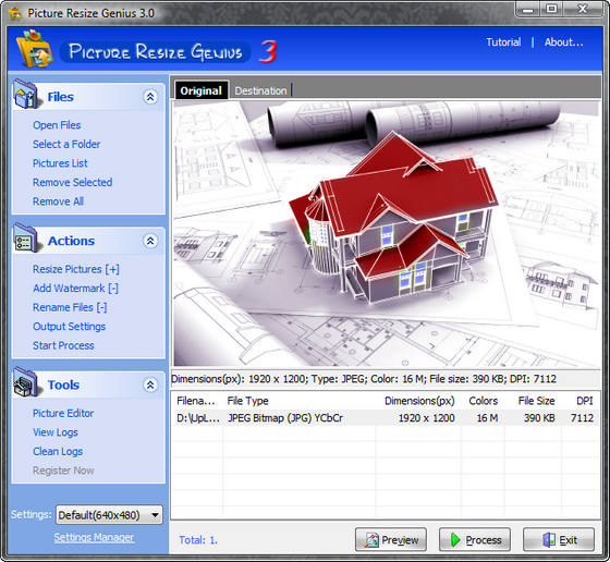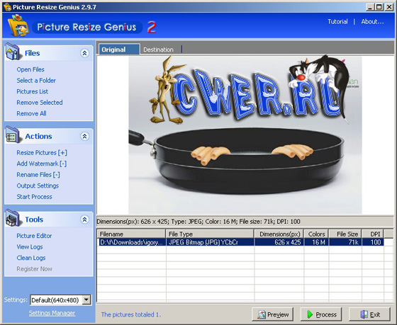 Picture Resize Genius дает возможность изменять размер целой группе рисунков, фотографий и изображений. Кроме этого можно наносить водяные знаки или логотип поверх изображения, переименовывать файл и многое другое. Вы сможете производить все эти действия над сотнями файлов одновременно, в течение нескольких секунд.