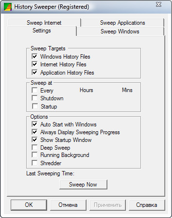 History Sweeper - программа для автоматической очистки временных файлов, которые в большом количестве остаются после серфинга. Таким образом, программа может выполнять несколько функций - обеспечивать вашу конфиденциальность, экономить место на жестком диске, а также удалять разнообразные шпионские модули. Автоматически очищает заданные вами папки, среди которых могут быть временные файлы, файлы History, Cookies, автозаполнение паролей и форм, корзина и пр. При этом программа делает очистку «на лету». В программе есть планировщик и функция "лапшерезки" т.е. гарантированно- безвозвратного удаления файлов.