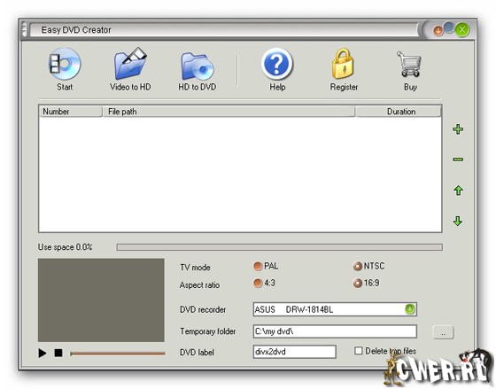 Easy DVD Creator - простой и удобный инструмент для конвертирования AVI/DIVX/XVID/DIV, MPEG/MPG/DAT, WMV/ASF/ASX, RM/RMVB, MOV/QT, 3GP/3G2, MP4/M4V, и FLV в DVD, которые вы сможете посмотреть на обычном домашнем DVD-плейере. С помощью Easy DVD Creator вы сможете превратить фильмы о ваших путешествиях, свадьбах, домашних торжествах в DVD, которые можно показать друзьям и семье! Просто добавьте видео-файлы в список файлов конвертера и нажмите кнопку “Start”