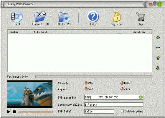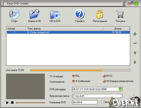 Easy DVD Creator - простой и удобный инструмент для конвертирования AVI/DIVX/XVID/DIV, MPEG/MPG/DAT, WMV/ASF/ASX, RM/RMVB, MOV/QT, 3GP/3G2, MP4/M4V, и FLV в DVD, которые вы сможете посмотреть на обычном домашнем DVD-плейере. С помощью Easy DVD Creator вы сможете превратить фильмы о ваших путешествиях, свадьбах, домашних торжествах в DVD, которые можно показать друзьям и семье! Просто добавьте видео-файлы в список файлов конвертера и нажмите кнопку "Start".
