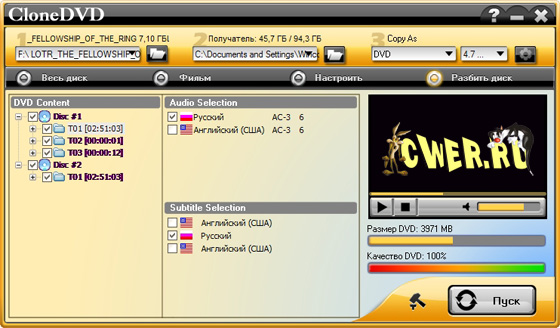 CloneDVD - программа предназначена для создания полностью идентичных копий DVD-фильмов и их записи на DVD-носители. Программа может полностью переписать содержимое диска, что позволяет создавать копии в режиме 1:1 (со всеми меню, субтитрами и т.д.). CloneDVD поддерживает работу с большинством существующих приводов, обладает хорошим быстродействием и качеством записи. Имеется русский интерфейс. В данной версии улучшено чтение проблемных секторов на некоторых приводах, исправлены ошибки, обновлены переводы, улучшен контроль над скоростью,и многое другое. Программа имеет мультиязычный интерфейс включая Русский.
