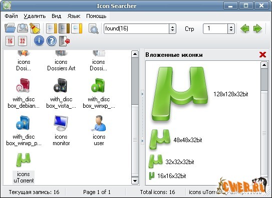 Программа для поиска, извлечения и сохранения иконок из файлов. Icon Searcher производит поиск иконок по всему жесткому диску или выборочно. Утилита читает форматы DLL, EXE, ICO, ICL, OCX, SCR, CPL, BPL, VBX, DRV и извлекает из файлов все доступные иконки. Программа помещает найденные иконки в собственную базу данных и может сохранить иконки в следующих форматах: BMP, ICO, JPG, GIF, PNG, PCX, TGA и TIFF. Есть возможность загрузки дополнительных коллекций иконок с сайта программы.