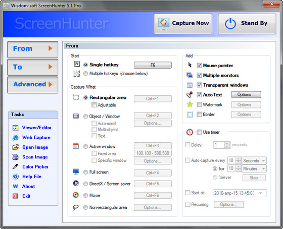 ScreenHunter - программа для получения снимков экрана (скриншотов) с возможностью их обработки и редактирования. Можно получать изображения всего экрана, отдельных окон или заданной области. Есть уникальная функция - получение снимков только определенных объектов в окнах, а также редко встречающаяся функция - захват текста.
