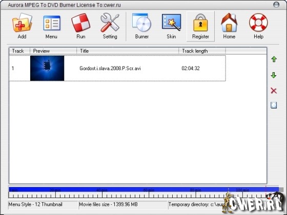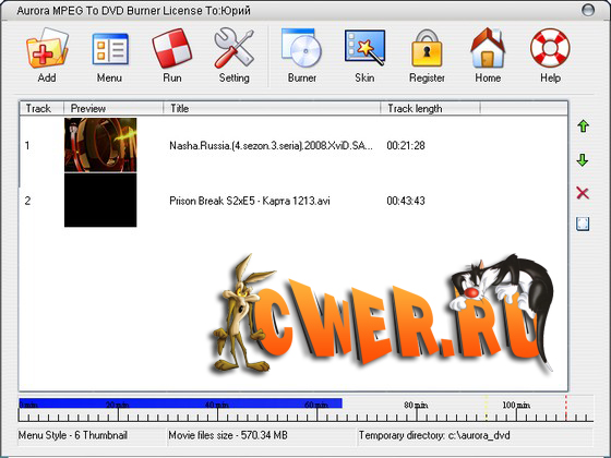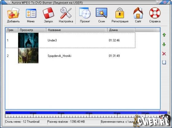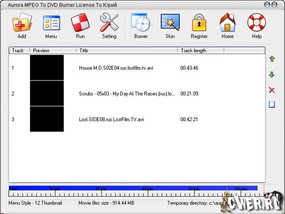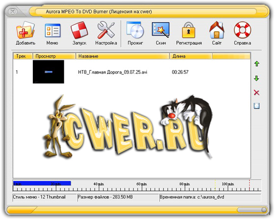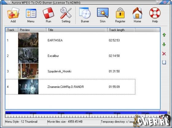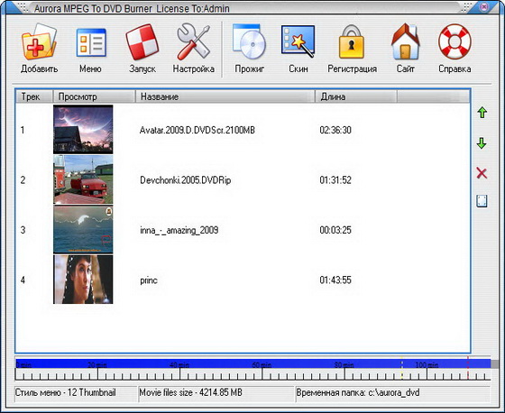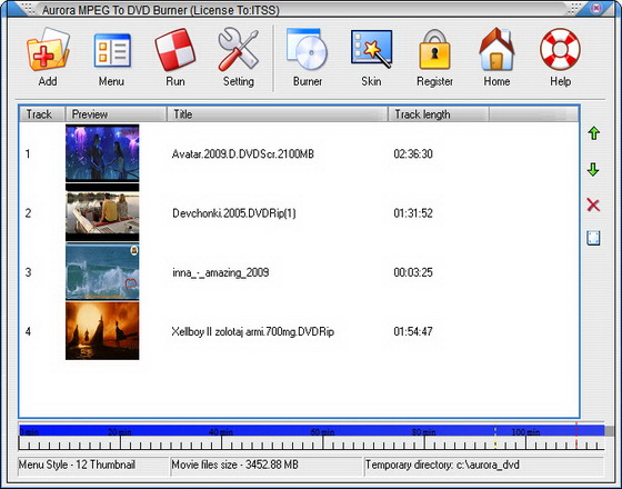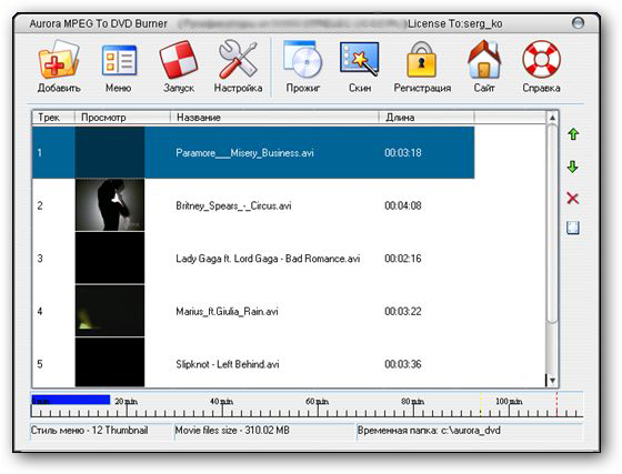 Aurora MPEG to DVD Burner - программа, предназначенная для записи AVI, MPEG файлов на диски DVD-R, DVD+R, DVD+RW, DVD-RW. Программа может создавать структуру DVD диска и записывать полноценные диски с меню. Для меню можно выбирать различные текстовые эффекты, фон, разметку. Диски не обязательно записывать сразу же – вы можете скомпоновать DVD и сохранить его в виде образа ISO или во временные папки на жестком диске. Программа имеет понятный пользовательский интерфейс и не вызовет каких-либо проблем при использовании.