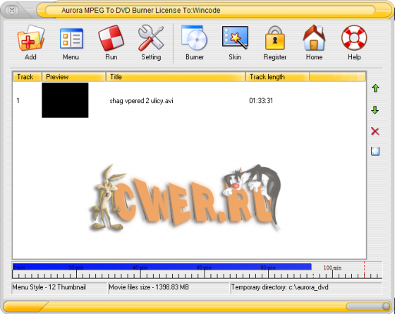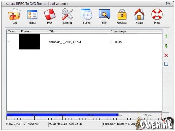 Aurora MPEG To DVD Burner - программа, предназначенная для записи AVI, MPEG файлов на диски DVD-R, DVD+R, DVD+RW, DVD-RW. Программа может создавать структуру DVD диска и записывать полноценные диски с меню. Для меню можно выбирать различные текстовые эффекты, фон, разметку. Диски не обязательно записывать сразу же – вы можете скомпоновать DVD и сохранить его в виде образа ISO или во временные папки на жестком диске. Программа имеет понятный пользовательский интерфейс и не вызовет каких-либо проблем при использовании.