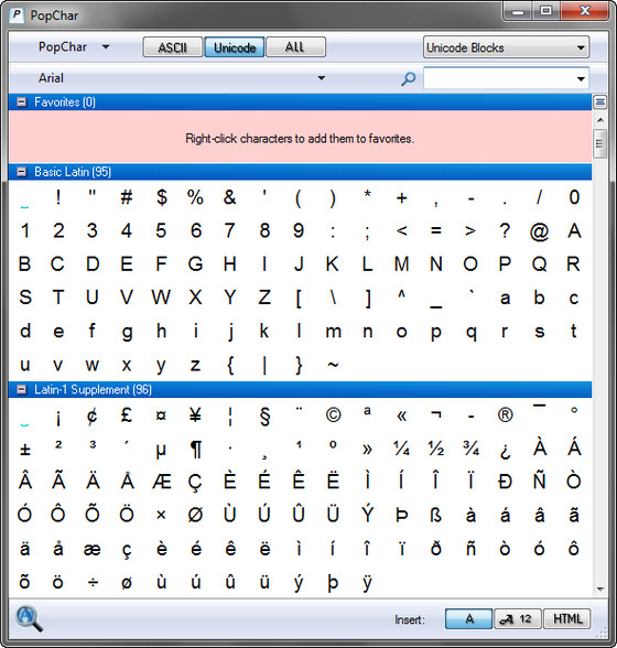 PopChar - утилита представляющая собой всплывающее окно, которое может располагаться поверх всех остальных окон и выводить таблицу различных символов, которые пользователь может вставить в текст любого документа. Кроме стандартных букв и чисел, клавиатура имеет множество других знаков, применяющиеся повсеместно, но которые не всегда можно легко вставить в текст. Для использования многих из них, требуется запомнить сложные комбинации клавиш, о которых вы можете просто не знать. Вот почему программа PopChar так полезна. Она позволяет вам вставлять спецсимволы в свои тексты на ходу, не теряя времени на подбор различных комбинаций клавиш или поиск их в интернете. Просто с помощью мыши выберите необходимый символ, и он может быть скопирован куда угодно - будь то текстовый редактор или email клиент. Программа может быть запущена определенной комбинацией клавиш и закрывается немедленно, сразу после вставки символа.