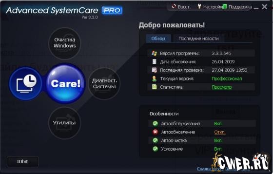 Advanced SystemCare (ранее Advanced WindowsCare)- программа, включающая в себя множество модулей для оптимизации, настройки и повышения производительности компьютеров, находящихся под управлением операционными системами Windows 2000/XP/Vista. Благодаря возможностям программы вы сможете очистить ПК от шпионского и рекламного ПО, обнаружить и заранее устранить возможные угрозы и бреши в системе безопасности ОС, исправить ошибки в системном реестре, очистить временные и ненужные файлы, управлять списками автозагрузок, оптимизировать работу систем.