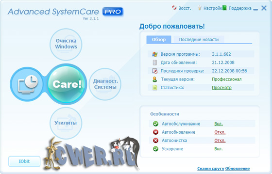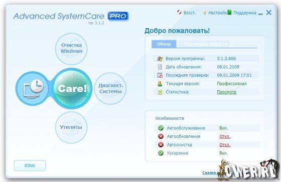 Advanced SystemCare(ранее Advanced WindowsCare) - программа, которая включает в себя множество модулей для настройки, оптимизации и повышения производительности компьютеров, находящихся под управлением ОС Windows 2000/XP/Vista.