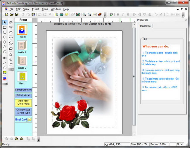 Belltech Greeting Card Designer - является профессиональным программным обеспечением, для разработки дизайна поздравительных открыток. Вы можете добавить свои собственные фотографии, клип-арты, рисунки и многое другое. Возможность добавить цвета и текстуры является уникальной особенностью этого приложения. Вы также можете копировать-вставить тексты и изображения из других приложений. Есть возможность сохранить ваш дизайн и изменить его позже. Можно вставить изображение в формате. JPG,. GIF,. BMP,. PNG,. TIF,. WMF.