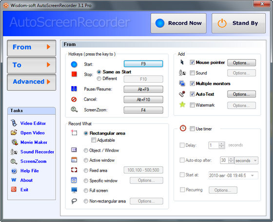 AutoScreenRecorder Pro - это легкая и мощная программа для видео записи всего, что происходит на экране вашего компьютера. Поддерживается запись звука. Программа работает с самыми популярными форматами видео (AVI, MPG, WMV и др.); возможна работа с несколькими мониторами одновременно. Игроков порадует функция онлайн записи игр без потери качества. AutoScreenRecorder обладает простым интерфейсом и поддерживает многократное увеличение экрана.