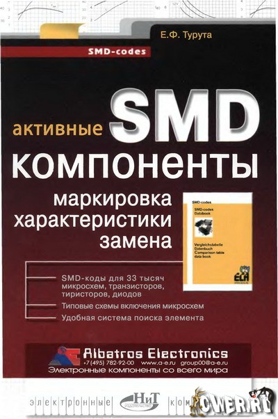 В справочнике приводится кодовая маркировка (SMD-коды) для более чем 33 тысячи активных электронных компонентов (диодов, тиристоров, биполярных и полевых транзисторов, интегральных микросхем). SMD-коды разделены по типам корпусов и расположены в таблицах в алфавитно-цифровом порядке. Даны, также, логотипы и адреса фирм-производителей электронных компонентов, схематические рисунки корпусов и назначение выводов (цоколевка) для дискретных полупроводниковых компонентов и большинства интегральных микросхем, типовые схемы подключения для большинства интегральных микросхем. Предназначен для специалистов в области проектирования, наладки и ремонта бытовой и профессиональной аппаратуры, широкого круга радиолюбителей и радиоинженеров.