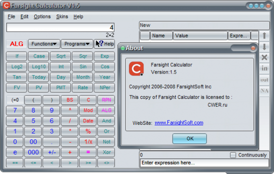 Farsight Calculator - удобный в работе программируемый Калькулятор, который позволяет сохранять процесс вычисления как программу или функцию, и выполнять арифметические операции любым RPN (Reverse Polish Notation) или ALG (Алгебраический) методом. Программа поддерживает больше чем сто функций, включая алгебраические, тригонометрические, гиперболические, статистические, и финансовые функции. Кроме того, Farsight Calculator содержит ряд мощных специализированных инструментов.