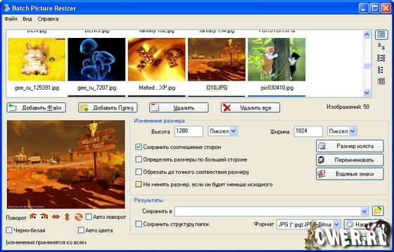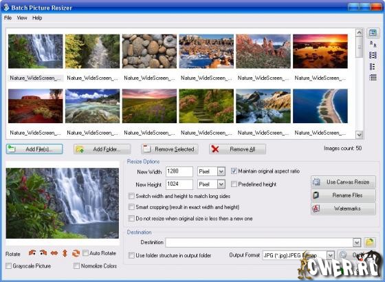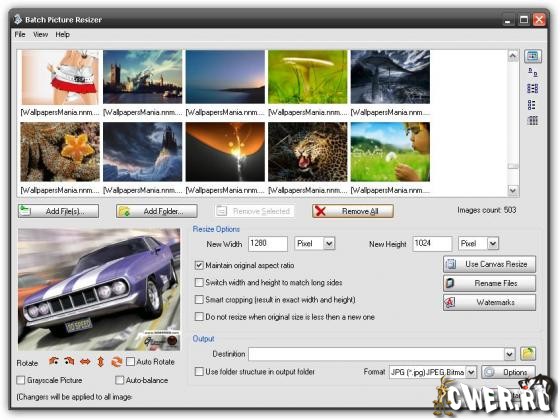 Batch Picture Resizer 3.0 - удобный инструмент позволяющий одновременно изменять размеры больших групп изображений. Batch Picture Resizer может работать с большинством популярных графических форматов, включая JPG, BMP, TIFF, GIF, PNG, PCX, TGA. Также имеются функии поворота изображений, в том числе автоматического, с учетом сведений о положении камеры в момет съемки, хранимом в JPEG файле. Имеется возможность добавления текстовых и графических водяных знаков, что позволяет защитить ваши програамы при публикации в сети интернет.