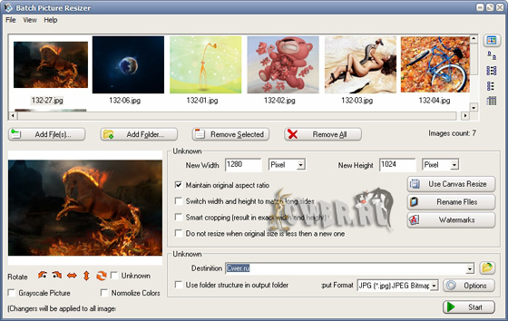 Batch Picture Resizer - программа для изменения размеров изображений, преобразования форматов, пакетной обработки фото, переименования файлов и добавления водяных знаков. Batch Picture Resizer работает с форматами JPG, BMP, TIFF, GIF, PNG, PCX, TGA и др. Утилита может не только изменить размеры фотографий, сохраняя высокое качество и применяя различные алгоритмы интерполяции, но и повернуть или зеркально отразить изображения без потерь качества. Batch Picture Resizer позволяет одним кликом мыши оптимизировать контраст, яркость и цветовые уровни, преобразовать изображения в черно-белый формат, добавить водяные знаки.