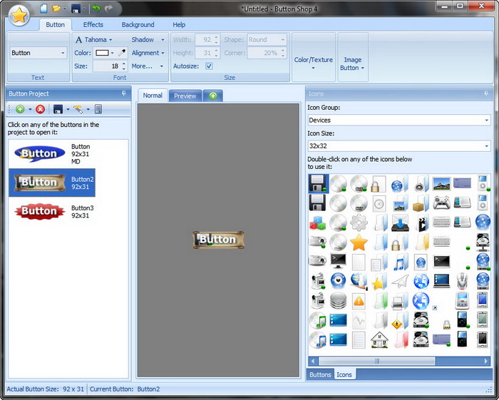 Программа для создания кнопок, которые могут быть использованы в различных приложениях Web. Для работы с Button Shop не требуется специальных знаний HTML и javascript. В комплект поставки включено свыше 200 готовых шаблонов и текстур, используя которые можно быстро и легко скомпоновать нужные кнопки. Button Shop автоматически генерирует код, готовый к использованию в проектах. Поддерживаются графические форматы BMP, GIF, JPEG, PNG, TIFF, EXIF, WMF, EMF, ICON, настройка цвета отдельных частей кнопок, прозрачность и другие эффекты.