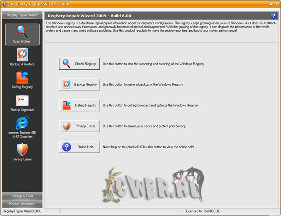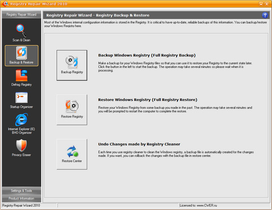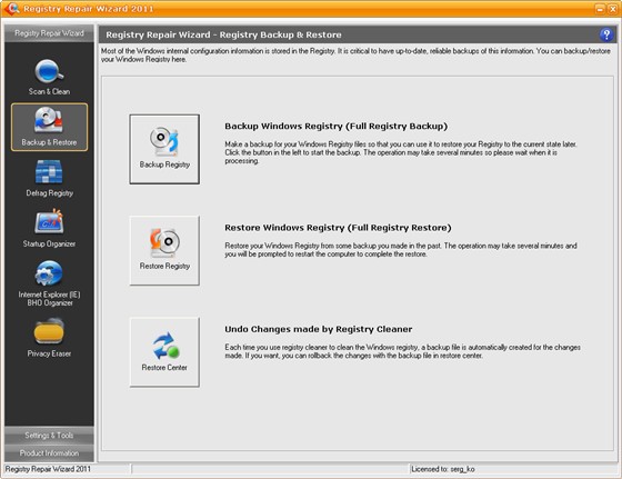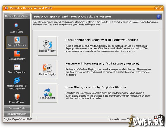 Registry Repair Wizard - программа для очистки реестра, которая позволит вам сканировать, восстанавливать и очищать системный реестр Windows несколькими щелчками мыши. Проблемы с системным реестром это наиболее общая причина аварий Windows и сообщений об ошибках. Функция полного резервного копирования реестра позволит вам его восстановить в дальнейшем, в случае любой системной аварии. Кроме того, эта утилита может уничтожать троянов, использующих реестр для своего распространения, и которые могут повредит вашу систему. Функции дефрагментации реестра и очистки приватных данных повышают функциональность программы и помогают вашему компьютеру работать значительно быстрее и без каких-либо ошибок.