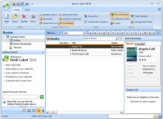 Book Label - программа от компании Codeaero, предназначенная для удобной организации больших собраний электронных книг. Программа автоматически находит информацию о той или иной книге в интернете и записывает ее на жесткий диск, позволяет выполнять сортировку и поиск по базе данных, отмечать книги, которые пользователь дал почитать друзьям (чтобы их не потерять), выполнять печать книжного каталога на принтере, создавать и работать с несколькими базами данных одновременно. Кроме того, программа позволяет настраивать внешний вид, выполнять экспорт книжного каталога в текстовом формате или HTML и вести статистику.