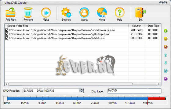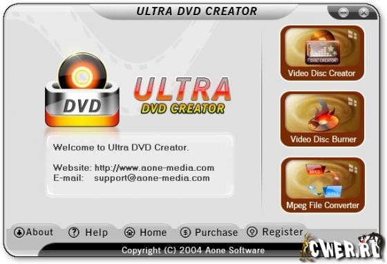 Ultra DVD Creator - мощный и удобный инструмент для создания DVD, VCD или SVCD видео дисков из, практически, всех видео-форматов AVI, DivX, XVid, MPEG, WMV, ASF, MOV, RM, MP4 и FLV. Благодаря возможностям данной утилиты вы сможете просматривать свою коллекцию видео файлов на обычном DVD-плеере у себя дома. С помощью этого программного обеспечения вы сможете конвертировать любые видео файлы в DVD, VCD или SVCD совместимый Mpeg-файл и записать его на CD или DVD диск. Используйте данную программу для создания VCD / DVD из ваших записей с видеомагнитофона, веб-камеры или скачанных файлов из интернета. Вы сможете создавать DVD-диски без каких либо специальных знаний в этой области.