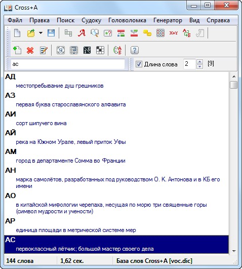 Компьютерная программа Cross+A предназначена для решения кроссвордов, сканвордов, криптарифмов, судоку и японских кроссвордов (черно-белых и многоцветных нонограмм), а также для поиска анаграмм, словосочетаний, цепочек слов и метаграмм.