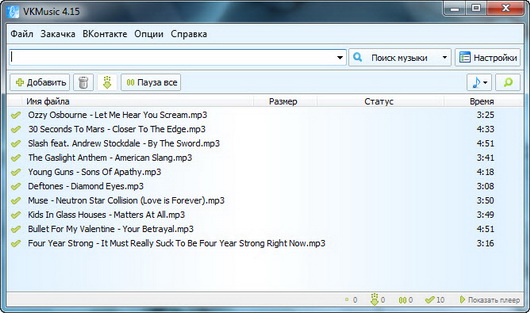 Качалка и поисковик треков с огромной базы mp3 файлов, залитых пользователями vkontakte.ru. VKMusic позволяет автоматизировать поиск нужных вам аудиозаписей и скачивание их на ваш компьютер, выбор музыки огромен. Также в программе реализован поиск видео на популярных видеосервисах. Авторизация не обязательна.