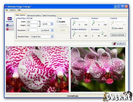 Вы когда либо хотели вмешаться и получить больший контроль над процессом увеличения фотографий? Теперь это возможно, с новыми инновационными технологиями в этом автономном приложении! Простые автоматические настройки программы делают Reshade Image Enlarger прекрасным выбором для начинающих, а наличие расширенных параметров настроек позволяют ее рекомендовать для профессионального использования. Никакой другой инструмент изменения размеров изображения на рынке ( Photoshop и третьи программы включительно) не позволяют вмешаться в этот процесс, как это предлагает Reshade Image Enlarger. Она выдает точное, высококачественное и реалистичное увеличение при любом коэффициенте масштабирования.