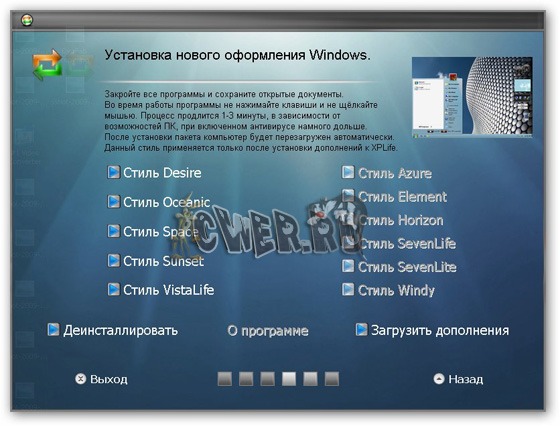 XPLife - программа предназначена для изменения интерфейса Windows XP x86 (32-bit), делая его похожим на Vista и Windows 7. Отличительной чертой XPLife является стабильная работа и поддержка двух собственных точек восстановления системы. При трансформации системы, изменяется огромное количество иконок, картинок, добавляются новые функции, звуки, курсоры, обновляются до 500 системных файлов, всего около 4000 ресурсов. Интерфейс XPLife выдержан в нескольких тонах, пятнадцать стилей оформления в версии 5.5 и десять тем в версии Lite, выбор удовлетворит даже самых требовательных пользователей. Программа изменяет только визуальную часть файлов Windows не затрагивая программный код, поэтому безопасна в использовании и не потребляет дополнительные ресурсы, используются только системные.