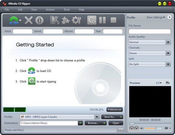 4Media CD Ripper - программа для извлечения треков с CD и конвертирования их в популярные аудио форматы такие, как: MP3, OGG, RA, WAV, WMA, WAV lossless, WMA lossless и другие. Также программа имеет возможность передачи файлов на такие устройства как IPod, iPhone и PSP сразу после копирования. Кроме того есть возможность добавления различных аудио эффектов (плавное появление - "затухание" звука, нормализация звука, хор, эхо и ускорение).
