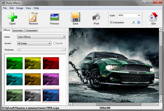 Photo Effects - это программа для обработки фотографий при помощи разнообразных фильтров. С её помощью можно полностью преобразить любое изображение. Программа позволяет использовать более 50-ти эффектов, включая как традиционные, так и оригинальные. Вы сможете увидеть свои фотографии на фоне дождя и снега, в тумане и под облаками, добавить солнечный свет или закружить в потоке тайфуна.