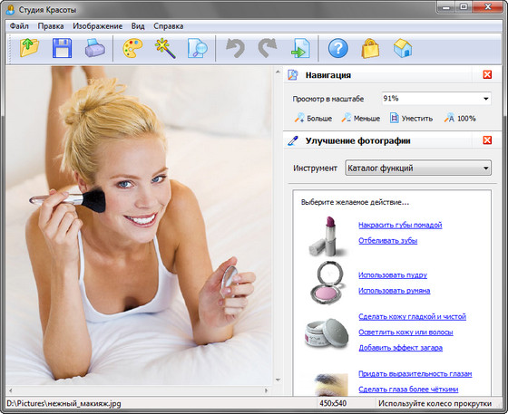 Beauty Studio - это новая программа для применения макияжа прямо на фотографии. С помощью этой программы вы можете легко удалить небольшие дефекты, создавать выразительные эффекты и даже изменить форму черт лица. Имеет удобный интерфейс. Beauty Studio позволяет в несколько минут как улучшить не очень хорошие изображения, так и сделать хорошие совершенными.