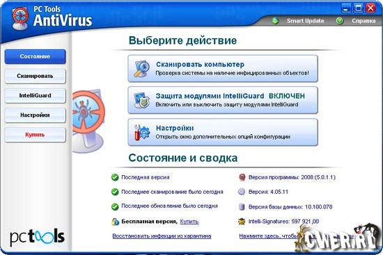 Программа для защиты системы от наиболее опасных кибер-угроз (вирусов, интернет-червей, троянов), пытающихся получить несанкционированный доступ к компьютеру и персональной информации. PC Tools AntiVirus обеспечивает хорошую защиту, работая в режиме реального времени с технологией OnGuard и используя всестороннюю систему сканирования.