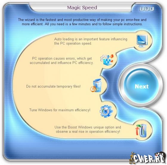 Magic Speed - программа для оптимизации работы операционной системы и очистки её от ненужных данных. В ней присутствуют средства для поиска и исправления ошибок в реестре Windows, проведения очистки системы от скопившихся временных файлов и включения некоторых опций операционной системы, повышающих её быстродействие. Magic Speed может анализировать автоматически запускаемые приложения, позволяя отключать загрузку неиспользуемых программ, а встроенный антивирусный движок поможет выявить среди них шпионские модули и другие вредоносные процессы. Кроме того, здесь имеются инструменты для дефрагментации оперативной памяти и ускорения загрузки системы. Для работы с приложением не требуется глубоких знаний ПК, все действия осуществляются с помощью пошагового Мастера оптимизации, все что от вас требуется, это 5 кликов мышкой.