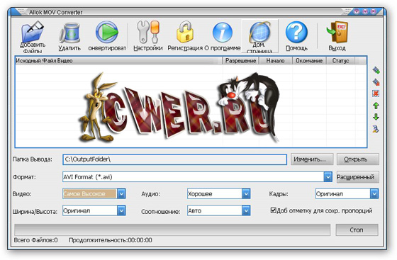 Allok MOV Converter - мощный конвертер видео-файлов. Конвертирует MOV в AVI, MPEG, WMV, DVD, VCD, MP4. Поддерживает конвертацию MOV, QT файлов в DVD-видео файлы(VIDEO_TS, AUDIO_TS) и VCD/SVCD образы (*.bin,*.cue). Также осуществляет прожиг дисков.