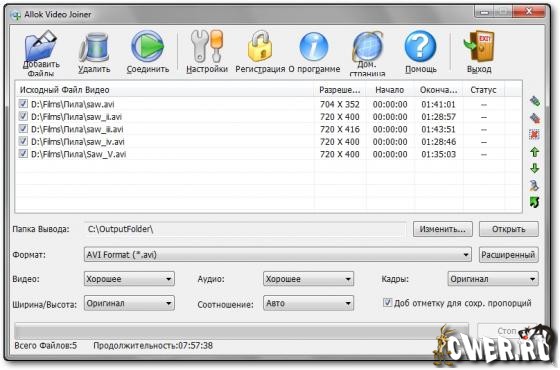 Allok Video Joiner - программа для создания одного большого медиа файла состоящего из AVI, Divx, XviD, MPEG I/II, VOB, DAT, ASF, WMV фрагментов. Позволяет соединять неограниченное количество видео файлов, сортировать последовательность фрагментов, добавлять к уже существующему проекту отрывки, сохранение проекта в AVI, MPEG, WMV, ASF форматах, встроенный проигрыватель поможет осуществить предварительный просмотр выбранного момента или просмотреть часть проекта. Программа проста в обращении, для получения конечного результата необходимо лишь несколько щелчков мышки, высокая скорость соединения без потери качества.