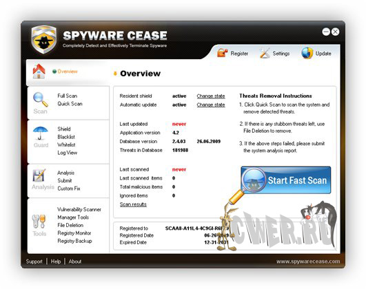 Spyware Cease – получившая множество наград Анти-Троянская программа для защиты вашего компьютера от шпионских атак, которые могут вызвать нежелательные всплывающие окна, замедлить производительность вашего ПК или "снять" с системы какую-либо секретную информацию, без вашего ведома, в виде паролей доступа, номеров кредитных карт и т п!