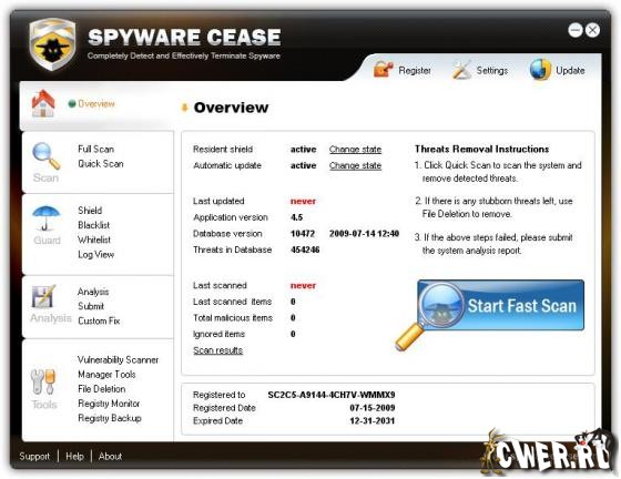Spyware Cease - программа для защиты вашего компьютера от шпионских атак, вредоносных троянских программ, которые могут вызвать нежелательные всплывающие окна, замедлить производительность вашего ПК или "снять" с системы какую-либо секретную информацию, без вашего ведома, в виде паролей доступа, номеров кредитных карт и т.п. С помощью данной программы вы сможете защитить ваш ПК от различных шпионских модулей.