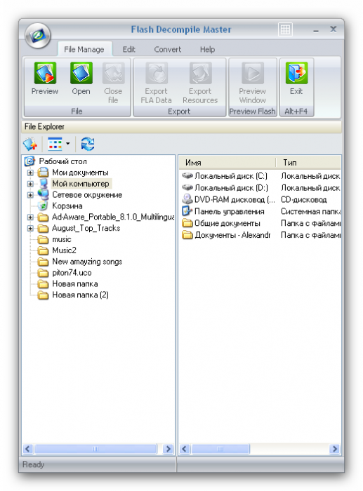 McFunSoft Flash Decompile Master - программа для извлечения ресурсов из SWF файлов (роликов Flash). Все составляющие (звуки,графику, видео, формы, фреймы, эффекты, шрифты, тексты, кнопки и спрайты) легко извлекаются на жесткий диск.
