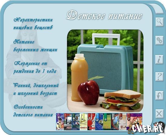 Для нормального развития ребенка необходимы не только любовь и забота близких, но и правильное питание. Здесь в 5 разделах представлена информация об особенностях здорового детского питания: Характеристики пищевых веществ; Питание беременных женщин; Кормление от рождения до 1 года; Ранний дошкольный и школьный возраст; Особенности деского питания.