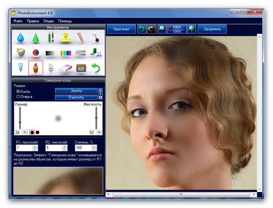 PhotoInstrument - легкий редактор для обработки портретов. От очистки кожи до придания ей гламурного вида "глянцевых журналов", инструменты для ретуширования, удаления красных глаз, сглаживания морщин, увеличения чёткости, коррекции цвета и многого другого, для приданию портрету совершенного вида и желаемой привлекательности – всё это вы получите, скачав приложение на cwer.ws.