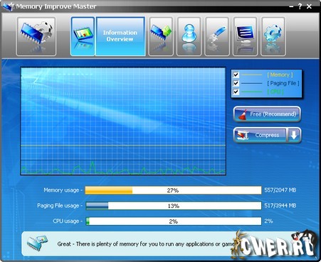 Memory Improve Master - позволяет увеличить быстродействие вашего компьютера за счет освобождения (дефрагментации) оперативной памяти. Имеется возможность установки минимального количества свободной оперативной памяти, при превышении которого запустится модуль и попытается удалить из оперативной памяти лишние процессы. Кроме этого, есть возможность просмотра запущенных процессов, наблюдение за нагрузкой на ЦП и множество других полезных настроек.