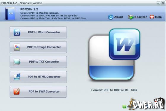 PDFZilla это программа которая быстро и аккуратно конвертирует PDF файлы в документы MS Word, документы Rich Text, текстовые файлы, изображения, HTML файлы и Flash SWF файлы. PDFZilla поддерживает множество популярных форматов: DOC, RTF, TXT, BMP, JPG, GIF, PNG, TIF, HTML, SWF.