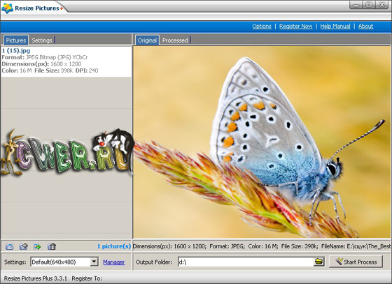 Resize Pictures Plus - простая в использовании программа для изменения размера и формата ваших фотографий в пакетном режиме. Позволяет пользователю в пакетном режиме изменить размер, качество, наложить водяной знак на картинку и конвертировать фотографии в один из форматов таких, как JPG, BMP, PNG, TIF, GIF, PCX и TGA.