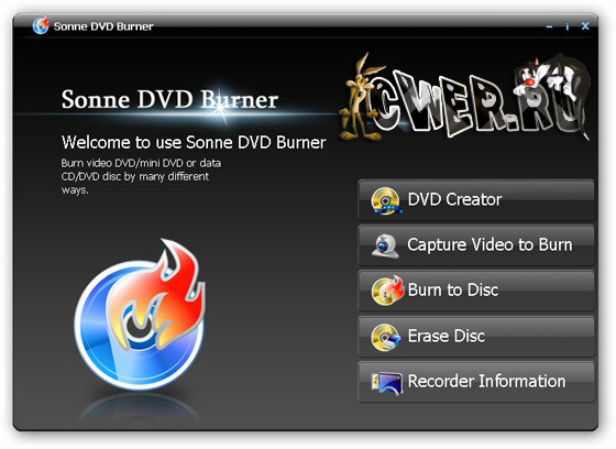 Sonne DVD Burner является мощной программой для записи DVD и предназначены для удовлетворения всех ваших потребностей в записи видео, файл образа ISO и VIDEO_TS с DVD диска и запись всех файлов на диск с данными, создание DVD из других видео файлов. Программа может захватывать видео для записи на DVD. Добавлена новая функция захвата для удовлетворения пользователей. Пользователи могут легко захватить видео или изображение из другого устройства, DV и ТВ-тюнера. Может записывать Audio CD из файлов MP3, создавать меню диска.