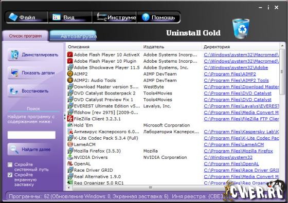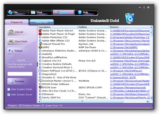 Uninstall Gold - программа для деинсталляции приложений, обладает большим количеством функций: показывает скрытые установленные программы, сортирует список программного обеспечения по заданному фильтру, удаляет некорректно инсталлированные и деинсталлированные программы.