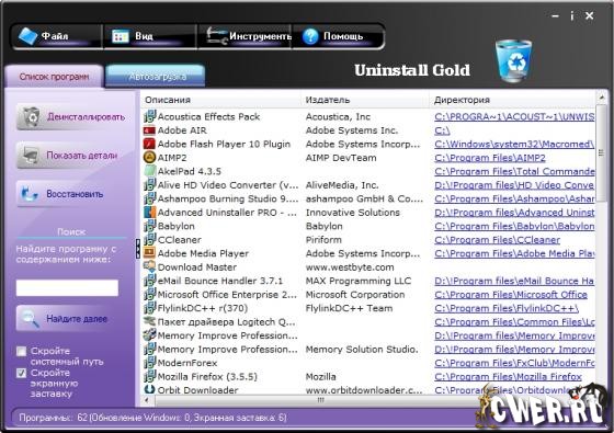 Uninstall Gold- программа для деинсталляции приложений, обладает большим количеством функций: показывает скрытые установленные программы, сортирует список программного обеспечения по заданному фильтру, удаляет некорректно инсталлированные и деинсталлированные программы.
