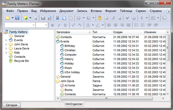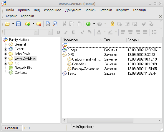 WinOrganizer - программа представляющая собой полномасштабный персональный информационный менеджер, способный помочь в организации и планировании вашей деловой и личной жизни. Это планировщик, записная и адресная книга, объединенные вместе. Электронный вариант органайзера вобрал в себя все возможности своего бумажного родственника в более удобном виде, что позволяет работать с ним быстрее и проще. Его интуитивный интерфейс объединил в наглядной и удобной древовидной форме, настраиваемой под конкретные нужды, все ваши заметки, праздники, памятные даты, списки задач, встречи, ссылки, контакты, пароли и пр. Ваши данные с легкостью могут быть защищены паролем и спрятаны от чужих глаз. И теперь уж вы точно не пропустите ни одного праздника или дня рождения, сможете легко отслеживать ежедневные задачи, будете предупреждены о приближающихся встречах и делах.