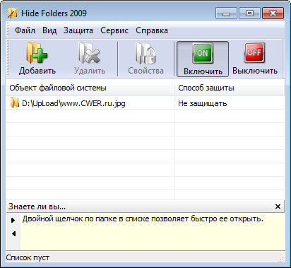 Hide Folders - это удобный инструмент для сокрытия вашей конфиденциальной информации от посторонних. Программа, которую можно бесплатно скачать на cwer.ws, позволяет скрывать целые папки на компьютерах под управлением Windows. Очень удобна и проста в использовании.