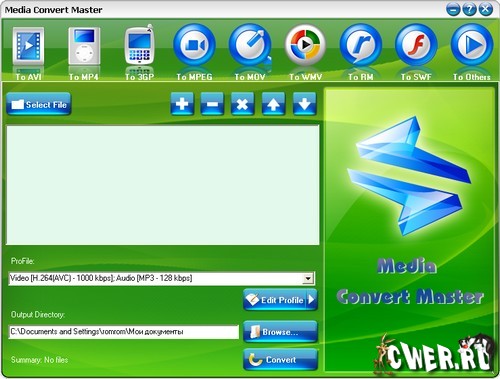Media Convert Master - профессиональный аудио/видео-конвертер, конвертирует ваши аудио- и видео- файлы из одного формата в другой. Поддерживается мультиформатное конвертирование, в частности AVI, MP4, 3GP, MPEG, MOV, WMV, RM, SWF, AAC, AC3, MP2, MP3, AMR, WAV, VOB and ASF. Экстремально профессиональное конвертирование с наиболее высоким качеством и скоростью! Благодаря простоте в управлении программа позволяет пользователю наслаждаться процессом конвертирования файлов.
