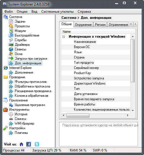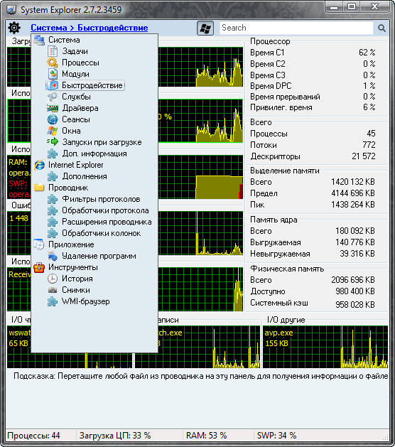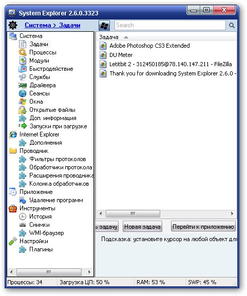 System Explorer - диспетчер задач для Windows. Функциональная, небольшая утилита, способная полностью заменить стандартный диспетчер задач. В System Explorer все строго структурировано и разложено по полочкам. Каждый раздел включает в себя подраздел, в котором и происходят основные манипуляции.