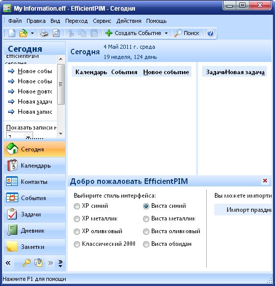 EfficientPIM - полнофункциональный персональный информационный менеджер, который поможет вам организовать и спланировать вашу рабочую и личную жизнь. С помощью этой программы можно отслеживать контакты, встречи, задачи, дни рождения, хранить заметки, вести дневники и даже хранить пароли с помощью встроенного менеджера паролей. Для того, чтобы стать успешным предпринимателем или просто человеком - нужно быть организованным и эффективным, в чем вам и поможет данная программа. Программой поддерживается создание нескольких независимых профилей для каждого пользователя, а также выбор индивидуального интерфейса.
