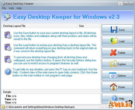 Easy Desktop Keeper - небольшая программа, которая дает вам возможность сохранять, восстанавливать, управлять и фиксировать ваш рабочий стол, включая папки, файлы, иконки и заставки. Если вы привыкли держать свой рабочий стол в порядке, то вам просто необходимо установить эту программу. Утилита будет полезна, когда кто-то, например ваши дети или сотрудники на работе, посидев за вашим компом изменили расположение ярлыков, папок, сменили фоновый рисунок и т.д. Теперь вам не надо тратить уйму времени на восстановление прежнего вида, с помощью данной утилиты достаточно загрузить заранее созданный макет рабочего стола и все вернется на прежние места. Вы cможете создавать неограниченное количество рабочих столов для разных целей, таких как игры, работа, интернет-серфинга и многого другого.